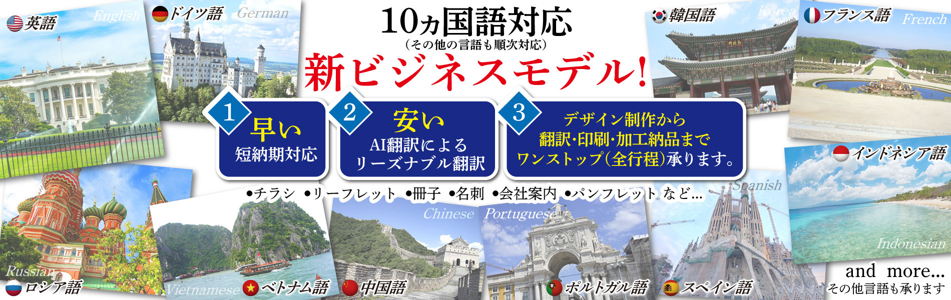 下のお見積もりフォームから、いくつかご質問に答えて頂くと、後日、メールでお見積もり結果をご連絡します。 お見積もりフォームはコチラ 企業パンフレットなど、専門用語を正確に機械翻訳いたします。もちろん、翻訳校正も行います。 ※メールにて、pdfデータ校正となります。 デザイン・翻訳校了になったら、すぐに当社で印刷工程に入ります。なので、急いで海外・外国人向けの印刷物が必要になった!時に便利です。